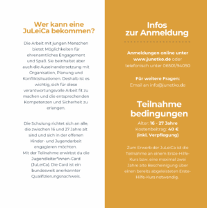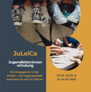 Die Jugendleiter*in-Card (Juleica) ist der bundesweit einheitliche Ausweis für ehrenamtliche Mitarbeiter*innen in der Jugendarbeit. Sie dient zur Legitimation und als Qualifikationsnachweis der Inhaber*innen. Bei der Juleica-Schulung bekommst du das richtige Handwerkszeug, um Gruppen mit Jugendlichen zu leiten. Du lernst wie man Spiele richtig anleitet, was zu tun ist wenn´s „brennt“, was Aufsichtspflicht bedeutet und vieles mehr. An unserer Schulung kann jede*r teilnehmen, der/die in der Jugendarbeit aktiv ist oder sein möchte und zwischen 16 und 27 Jahren alt ist.