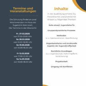 Die Juleica-Schulung findet im Haus der Jugend Konz, Wiltinger Straße 48 statt. Im Teilnehmerbeitrag von 40 € ist eine Verpflegung inklusive.